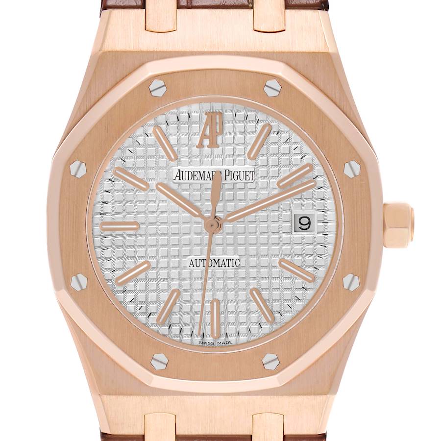 Audemars Piguet Royal Oak Rose Gold Silver Mens Watch 15400OR. Automatic self-winding movement. 18k rose gold case 41.0 mm in diameter. Audemars Piguet logo on the crown. 18k rose gold bezel punctuated with 8 signature screws. Scratch resistant sapphire crystal. Silver Tapisserie (waffle pattern) dial with luminescent rose gold index hour markers and hands. 18k rose gold sweep seconds hand. Date window at the 3 o'clock aperture. Brown leather strap with an 18k rose gold deployant clasp.
