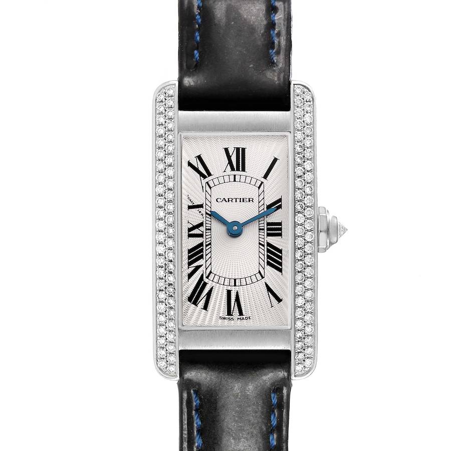 Cartier Tank Americaine White Gold Diamond Ladies Watch WB701851. Quartz movement. 18K white gold case 19.0 x 35.0 mm with 2 rows of diamond on the sides. Circular grained crown set with faceted diamond. . Scratch resistant sapphire crystal. Silver guilloche dial with black roman numerals. Sword shape blue steel hands. Secret Cartier signature at X. Black leather strap with blue stitching and 18K white gold tang buckle.