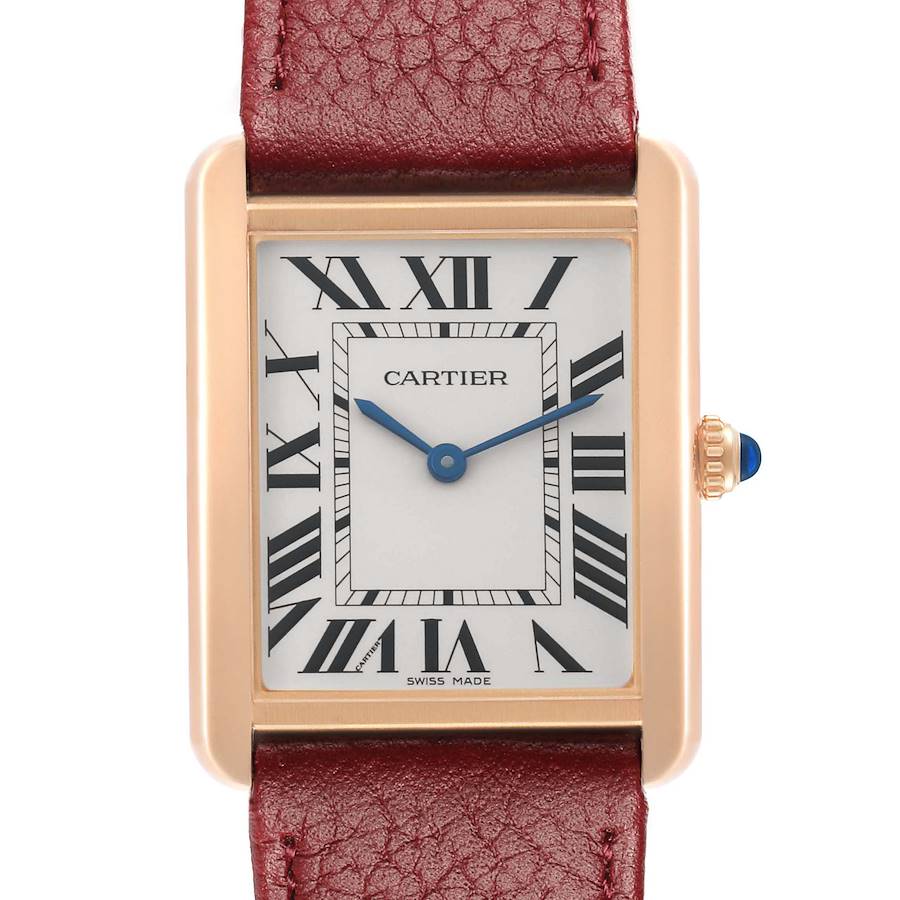 Cartier Tank Solo Large Rose Gold Mens Watch W5200025 Papers. Quartz movement. 18k rose gold rectangular case 34.0 x 27.0 mm. Stainless steel case back. Circular grained crown set with a blue spinel cabochon. . Scratch resistant sapphire crystal. Silver opalined dial with black radial Roman numeral hour markers and an inner minute track. Sword-shaped blued steel hands. Secret Cartier signature at VII. Burgundy leather strap with an 18k rose gold tang buckle.