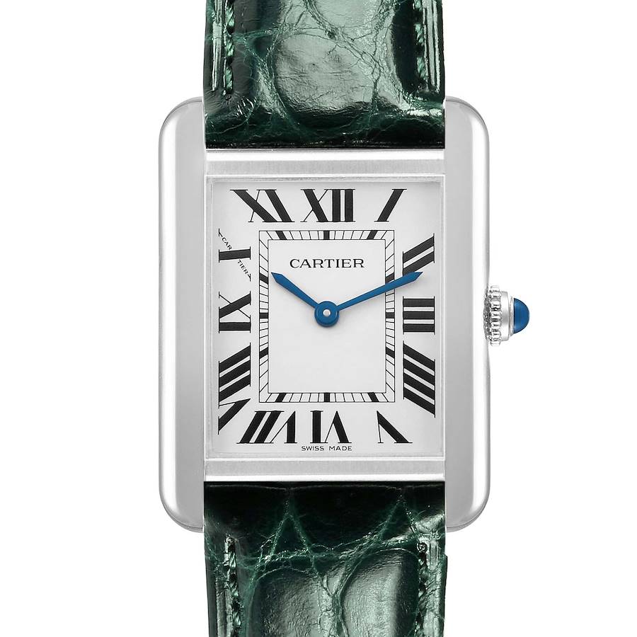 Cartier Tank Solo Steel Green Strap Ladies Watch WSTA0030. Quartz movement. Stainless steel case 31.0 x 24.4 mm. Circular grained crown set with the blue spinel cabochon. . Scratch resistant sapphire crystal. Silver opaline dial. Painted black roman numerals. Sword shaped blued steel hands. Secret Cartier signature at X. Green strap with the stainless steel deployant buckle.
