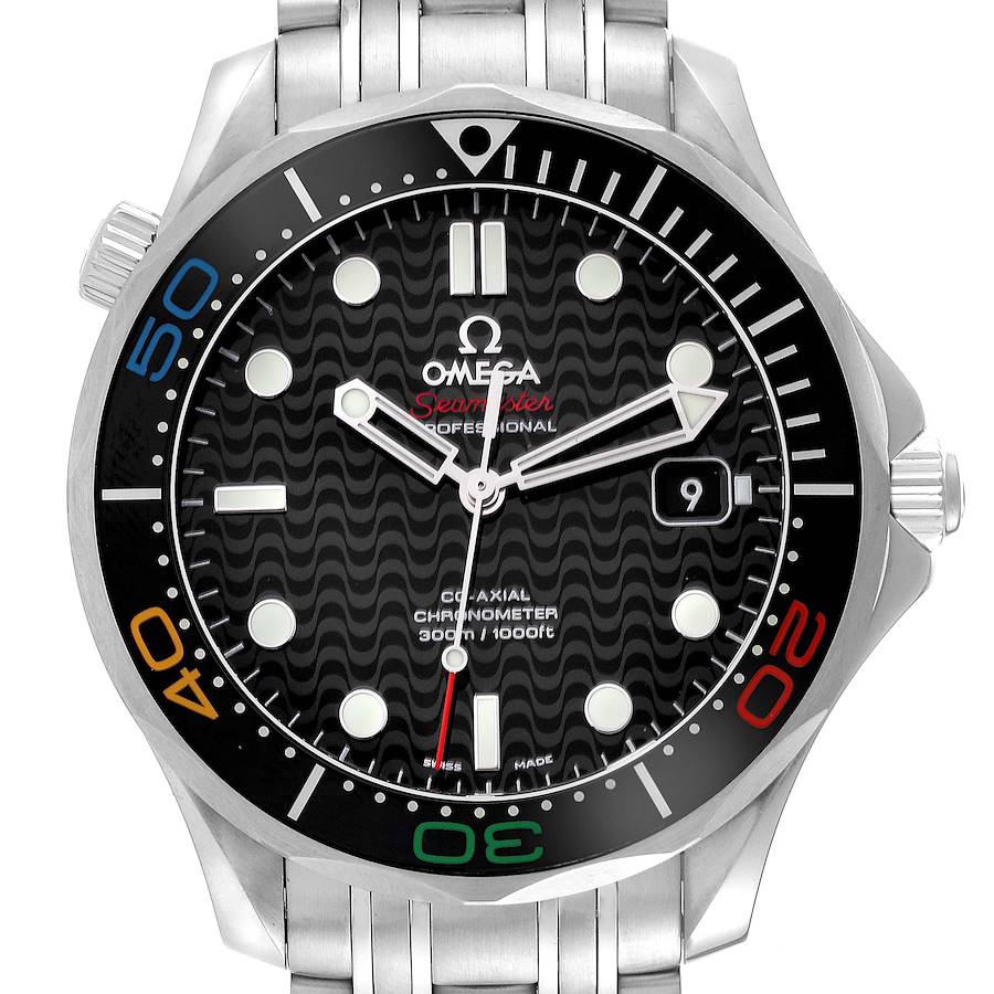 | Bezel: | Black unidirectional rotating ceramic bezel ring includes a diving scale filled with white Super-LumiNova and numerals filled with red, blue, yellow, and green lacquer, representing the colours of the Olympic rings. |