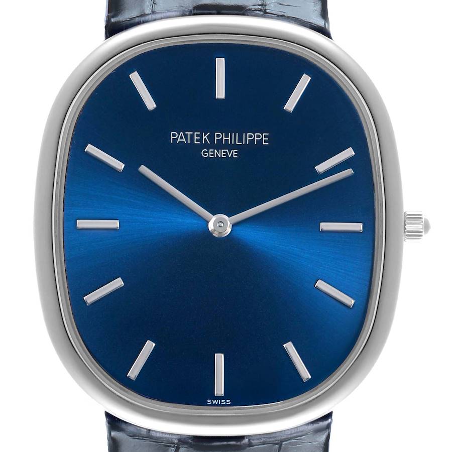 Patek Philippe Golden Ellipse Grande Taille Platinum Mens Watch 5738P Box Papers. Automatic self-winding lever movement. Platinum ultra-thin case 34.5 x 39.5 mm. Diamond between the T-bar lugs at 6. . Scratch resistant sapphire crystal. Blue sunburst dial with raised white gold baton hour markers. 18K gold dial plate. White gold cheveu-style hands. Blue strap with platinum tang buckle.