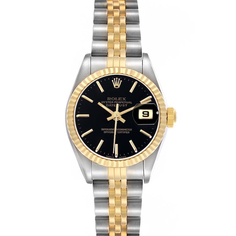 Rolex Datejust Black Dial Steel Yellow Gold Ladies Watch 79173. Officially certified chronometer automatic self-winding movement. Stainless steel oyster case 26.0 mm in diameter. Rolex logo on the 18K yellow gold crown. 18k yellow gold fluted bezel. Scratch resistant sapphire crystal with cyclops magnifier. Black dial with yellow gold baton hour markers and hands. Date calendar at the 3 o'clock aperture. Stainless steel and 18k yellow gold jubilee bracelet with a fold-over clasp. Fits a 6 1/4" wrist.