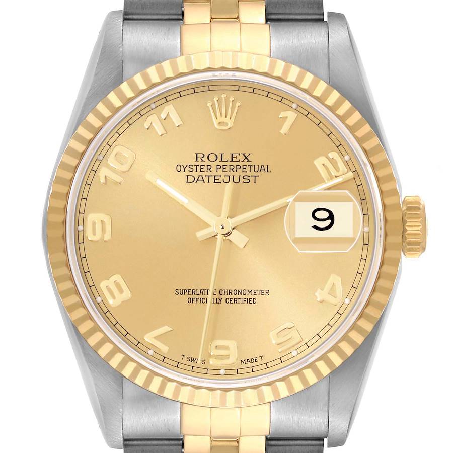 Rolex Datejust Steel Yellow Gold Champagne Dial Mens Watch 16233 Papers. Officially certified chronometer automatic self-winding movement. Stainless steel oyster case 36.0 mm in diameter. Rolex logo on the 18K yellow gold crown. 18k yellow gold fluted bezel. Scratch resistant sapphire crystal with a cyclops magnifier. Champagne dial with yellow gold baton hands and yellow gold Arabic numeral hour markers. Date calendar at the 3 o'clock aperture. Stainless steel and 18k yellow gold jubilee bracelet with a fold-over clasp. Fits a 7 1/2" wrist.