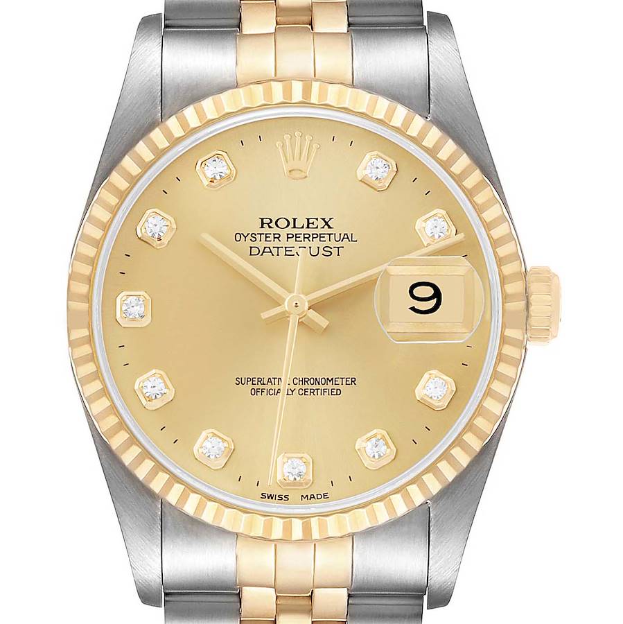 Rolex Datejust Steel Yellow Gold Champagne Diamond Dial Mens Watch 16233. Officially certified chronometer automatic self-winding movement. Stainless steel oyster case 36.0 mm in diameter. Rolex logo on the 18k yellow gold crown. 18k yellow gold fluted bezel. Scratch resistant sapphire crystal with a cyclops magnifier. Champagne dial with original Rolex factory diamond hour markers and luminescent yellow gold baton hands. Date calendar at the 3 o'clock aperture. Stainless steel and 18k yellow gold jubilee bracelet with a fold-over clasp. Fits a 7.5" wrist.