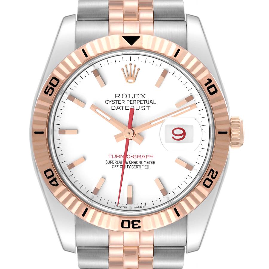 NOT FOR SALE -Rolex Datejust Turnograph Steel Rose Gold Mens Watch 116261 - PARTIAL PAYMENT. Officially certified chronometer automatic self-winding movement with quickset date function. Stainless steel case 36 mm in diameter. Rolex logo on the crown. 18k rose gold fluted bidirectional rotating turnograph bezel. Scratch resistant sapphire crystal with cyclops magnifier. White dial with raised rose gold baton hour markers. Date window at 3 o'clock aperture. Red seconds hand and date wheel. Stainless steel and 18K rose gold jubilee bracelet with hidden clasp. Fits 7" wrist.