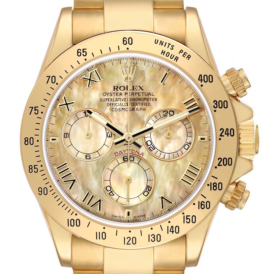 Rolex Daytona Mother of Pearl Dial Yellow Gold Mens Watch 116528. Officially certified chronometer automatic self-winding movement. Rhodium-plated, oeil-de-perdrix decoration, straight line lever escapement, monometallic balance adjusted to 5 positions, shock absorber, self-compensating free sprung Breguet balance spring, Microstella regulating screws, hack mechanism. 18K yellow gold case 40.0 mm in diameter. Special screw-down push buttons. Triplock winding crown protected by the crown guards. 18K yellow gold tachymeter engraved bezel. Scratch resistant sapphire crystal. Yellow mother of pearl dial with raised Roman numeral hour markers. Outer 1/5th seconds track. Gold outlined subsidiary dials for the seconds, the 12-hour and 30-minute registers. Luminous yellow gold baton hands. 18K yellow gold oyster bracelet with flip-lock clasp. Will fit up to 7 1/4" wrist.