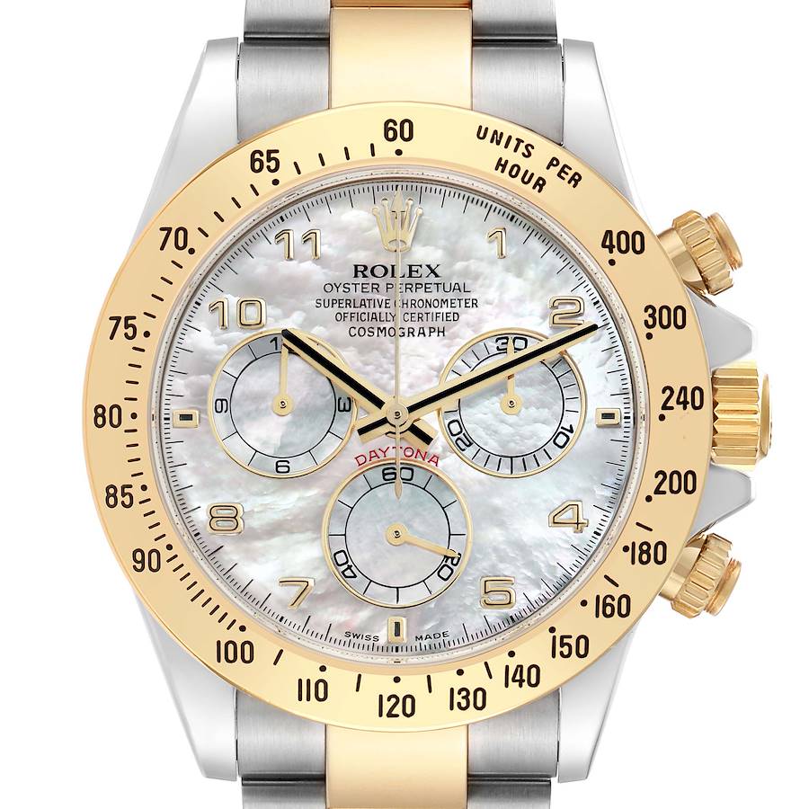 Rolex Daytona Steel Yellow Gold MOP Dial Mens Watch 116523 Card. Officially certified chronometer automatic self-winding movement. Stainless steel and 18K yellow gold oyster case 40.0 mm in diameter. Special screw-down push buttons. Triplock winding crown protected by the crown guards. Two 18k yellow gold pushers operate the chronograph functions. Rolex logo on the 18k yellow gold crown. 18K yellow gold bezel engraved with the tachymeter scale. Scratch resistant sapphire crystal. Mother of pearl dial with raised yellow gold Arabic numerals and square index hour markers. Outer minute and 1/5-second stick markers. Three yellow gold-outlined subdials--running small seconds, 12 hours, and 30-minute chronograph registers. Stainless steel and 18K yellow gold oyster bracelet with a flip-lock clasp. Fits a 7 3/4" wrist.
