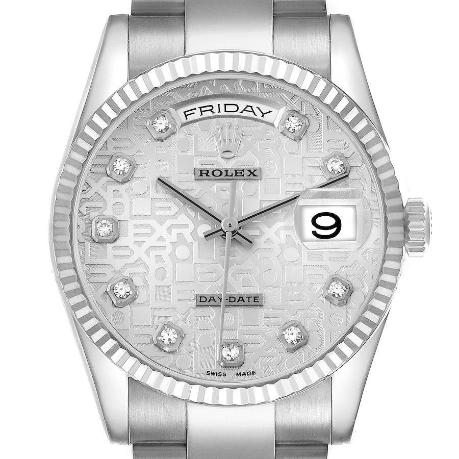 NOT FOR SALE -Rolex President Day-Date White Gold Silver Diamond Dial Mens Watch 118239 - PARTIAL PAYMENT FOR MG 1 OF 2. Officially certified chronometer automatic self-winding movement. 18k white gold oyster case 36.0 mm in diameter. Rolex logo on the crown. 18k white gold fluted bezel. Scratch resistant sapphire crystal with a cyclops magnifier. Silver jubilee anniversary dial with original Rolex factory diamond hour markers and white gold baton hands. Sweeping centre seconds hand. Outer minute and 1/2 seconds divisions. Aperture for weekday at 12 o'clock. Aperture for date at 3 o'clock. 18k white gold oyster bracelet with a hidden clasp. Fits a 7 1/4" wrist.