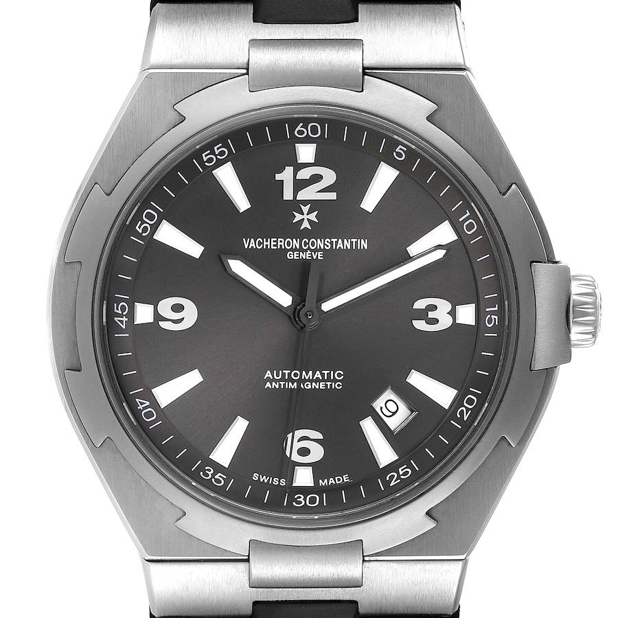 Vacheron Constantin Overseas Steel Grey Dial Mens Watch 47040. Automatic self-winding movement. Stainless steel round case 42.0 mm in diameter. Vacheron Constantin logo on the screwed-down crown. Solid case back with 'overseas' medalion. Stainless steel bezel. Scratch resistant sapphire crystal. Grey dial with luminescent baton hands and index hour markers. Arabic numerals at 3, 6, 9, and 12 o'clock. Minute markers around the outer rim. Date display window between the 4 and 5 o'clock position. Black rubber strap with a stainless steel deployant clasp with a Vacheron Constantin logo on the tang buckle.